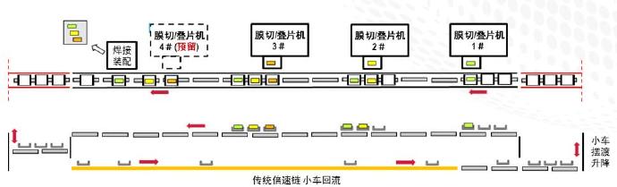 智能動力滑塊小車輸送系統(tǒng)跟隨疊片機(jī)的生產(chǎn)節(jié)拍;