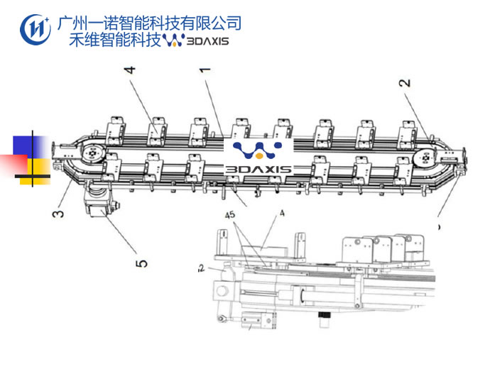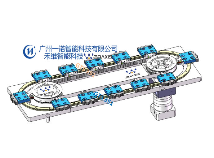 用于生物耗材試劑管生產(chǎn)組裝及檢測技術領域,在環(huán)形軌道輸送線上設有環(huán)形軌道,環(huán)形軌道包括兩個平行設置的直軌道,以及分別連接直軌道兩端的兩個彎軌道。在廣州一諾智能科技(禾維智能廣州)GTS精密環(huán)形軌道輸送線上方安裝有定位治具,定位治具與設于環(huán)形軌道上的環(huán)形輸送帶之間通過輪齒進行嚙合,在環(huán)形軌道輸送線上還設有鎖緊機構。