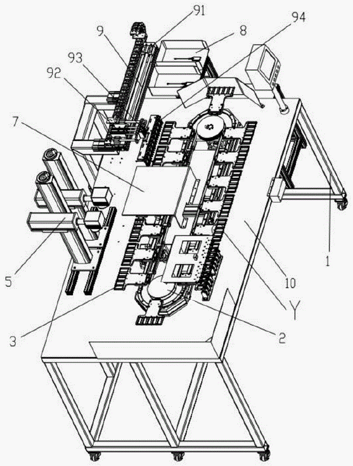 所述環(huán)形搬運(yùn)件2、檢測(cè)組件4、上打碼組件5以及下打碼組件6均與外部控制系統(tǒng)電性連接,所述放料組件3、水平搬運(yùn)件9以及收料組件8均與外部控制系統(tǒng)連接。